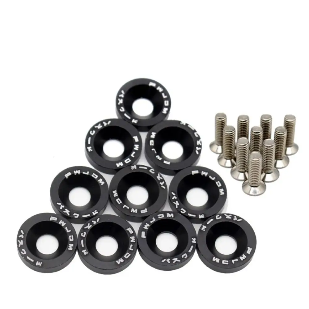 10 Adet M6 Scooter Vida Pul Seti – Siyah, dayanıklılığı ve stili güçlendirmek için yüksek kaliteli alüminyumdan yapılmıştır. Altıgen cıvata stiline bağlı olarak metal veya plastik uygulamalar için perçin olarak da kullanılabilir. Her pakette cıvata için bir pul görevi görmek üzere delinmiş bir delik içine yerleştirilebilen bir taban bulunur.