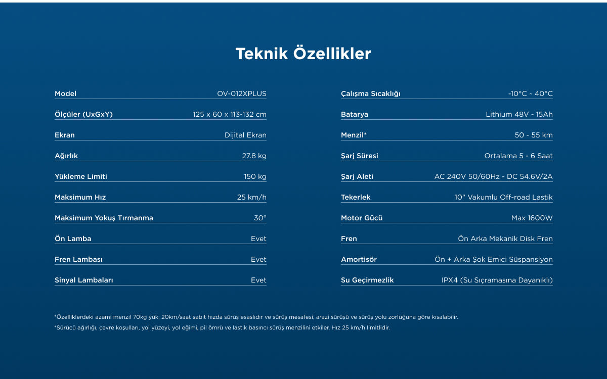 ONVO OV-012 X Plus’ın sunduğu 50 km maksimum menzil ile şehrin birçok yerine ulaşabilirsiniz. Tek şarjla uzun mesafe kat edebilme özelliği sayesinde günlük rutininizi fazla kesintiye uğratmadan seyahat edebilirsiniz. 75 dakikalık maksimum batarya süresi ile ortalama şehir içi yolculuklarınızı tamamlayabilirsiniz.