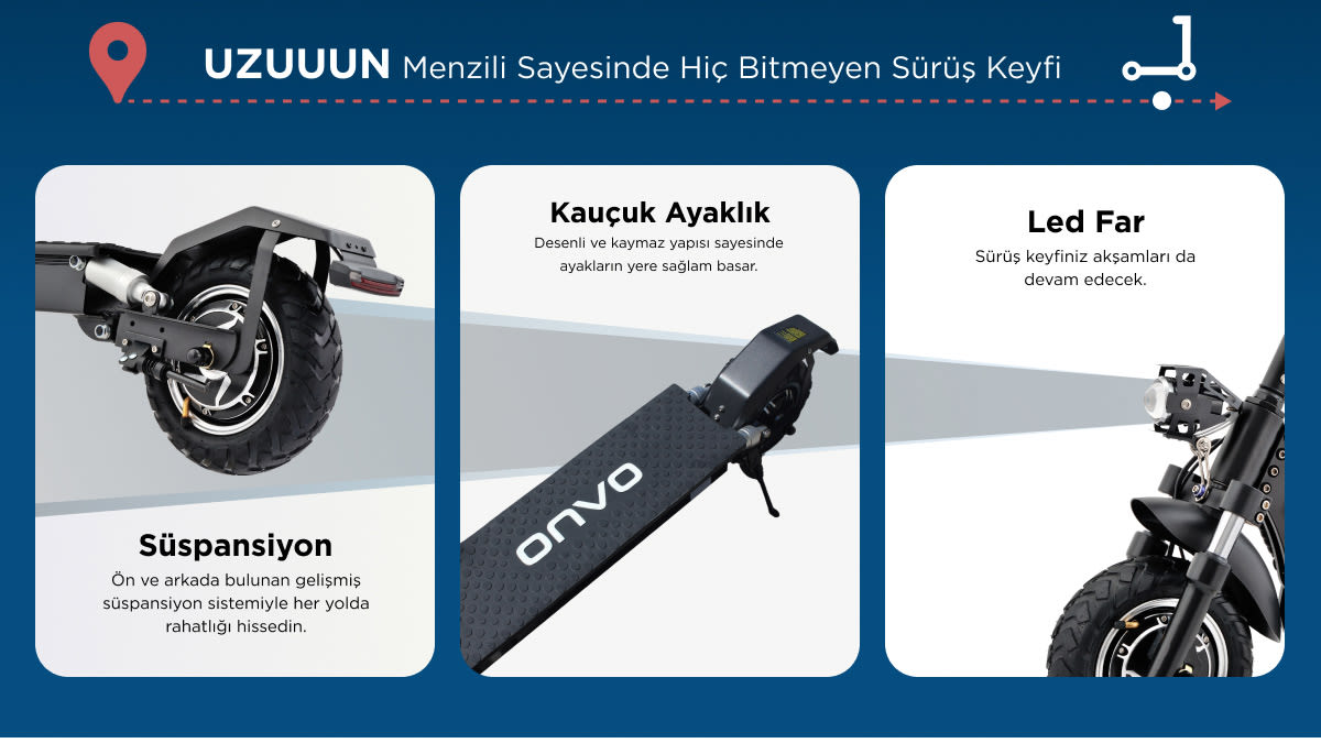 ONVO OV-012 X Plus 50 km menzilli elektrikli scooter 150 kg maksimum taşıma kapasitesine sahiptir. Bu sayede farklı vücut ağırlıklarına sahip kullanıcılar tarafından rahatça kullanılabilir. Güçlü taşıma kapasitesi sayesinde çok ağır olmayan eşyalarınızı da beraberinizde taşıyabilirsiniz.