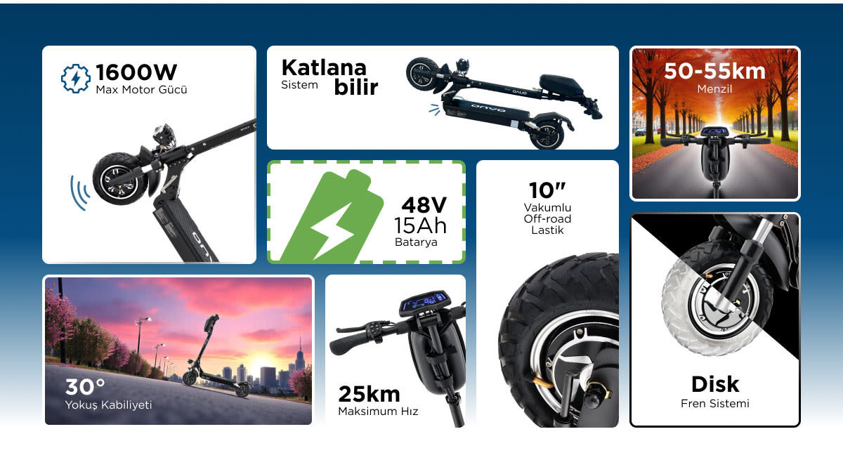 ONVO OV-012 X Plus elektrikli scooter, şehir içi ulaşımında size özgürlük sunan güçlü bir alternatiftir. Dar sokaklarda ve kalabalık alanlarda kolaylıkla manevra yapmanıza olanak tanır, sizi gideceğiniz yere konforlu bir şekilde ulaştırır.
